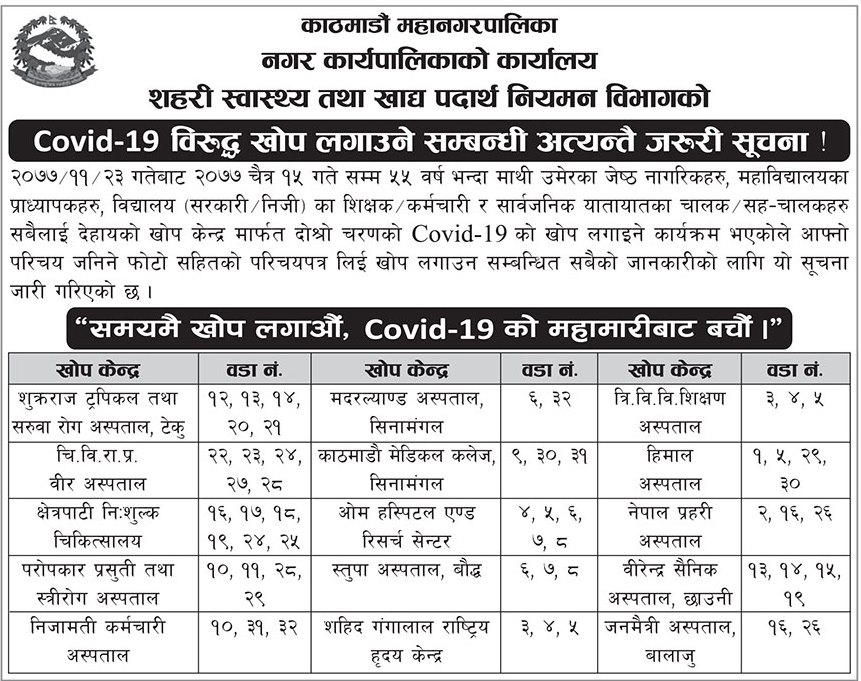 खोप लगाउने सम्बन्धमा काठमाडौं महानगरपालिकाले सुचना मार्फत जानकारी दिएको हो । खोपका लागि विभागले १५ वटा केन्द्र तोकेको छ ।